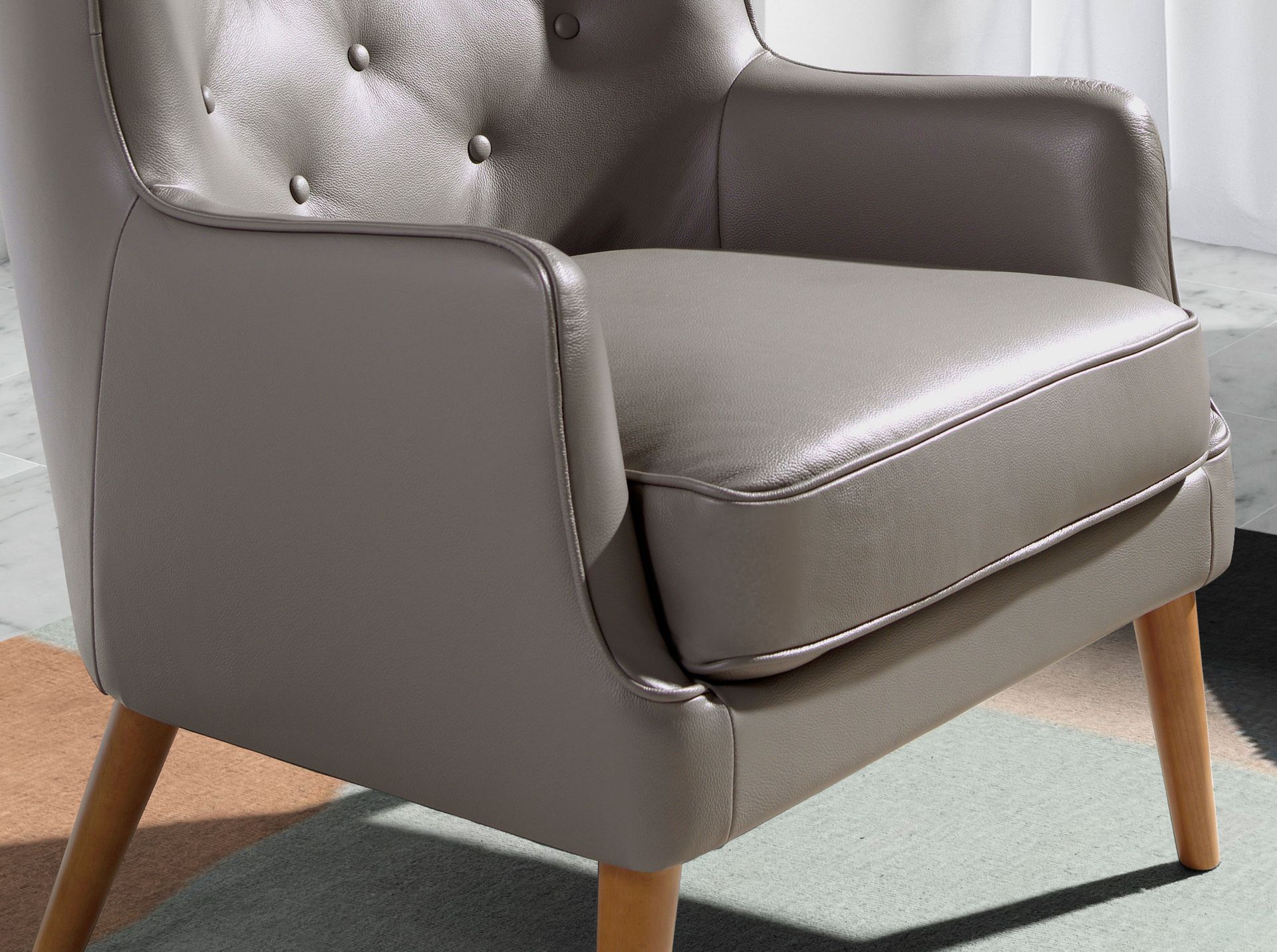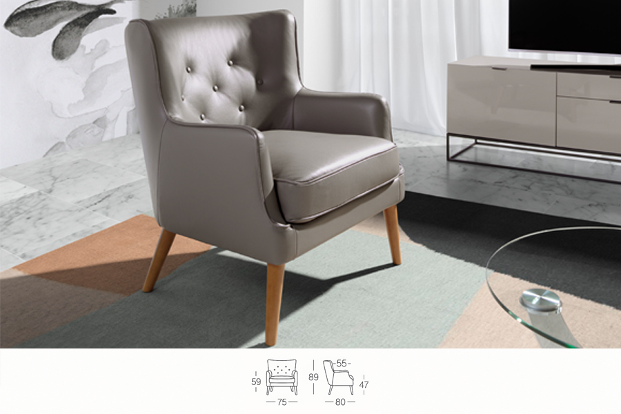 Sillón Chester de diseño moderno tapizado en piel de origen vacuno. Tanto por su estilo, como por sus patas de madera color nogal, este sillón aportará el toque de vanguardia y elegancia que busca para su hogar.