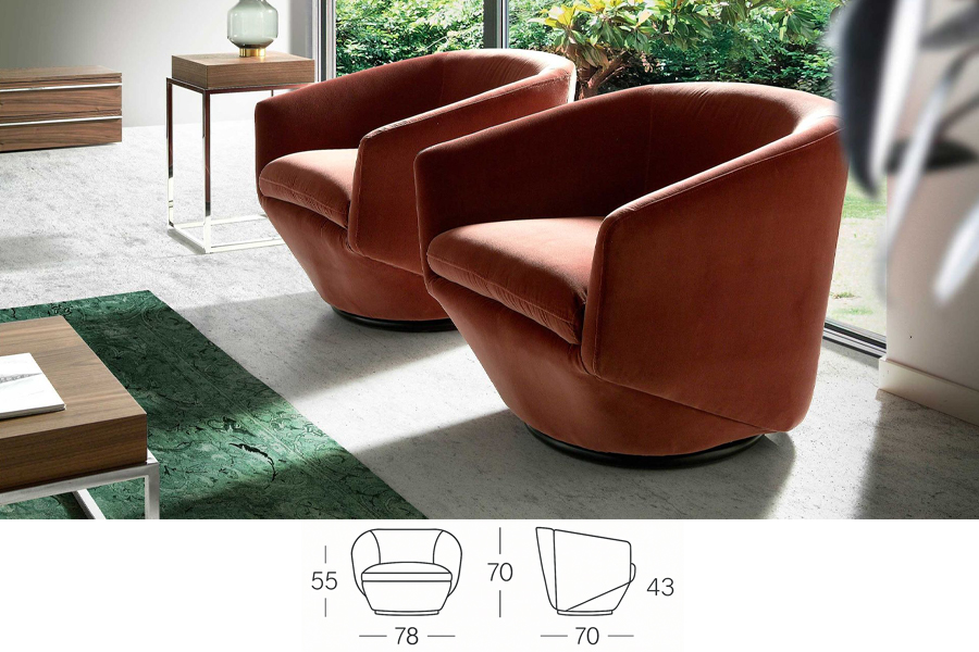 Sillón giratorio de diseño moderno tapizado en tela aterciopelada. Tanto por su estilo, como por sus patas de acero inoxidable oscurecido, este sillón aportará el toque de vanguardia y elegancia que busca para su hogar.