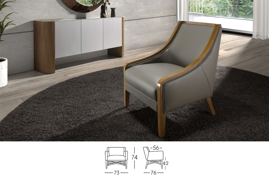 Sillón de diseño moderno tapizado en piel de origen vacuno. Tanto por su estilo, como por sus patas de madera color miel, este sillón aportará el toque de vanguardia y elegancia que busca para su hogar.