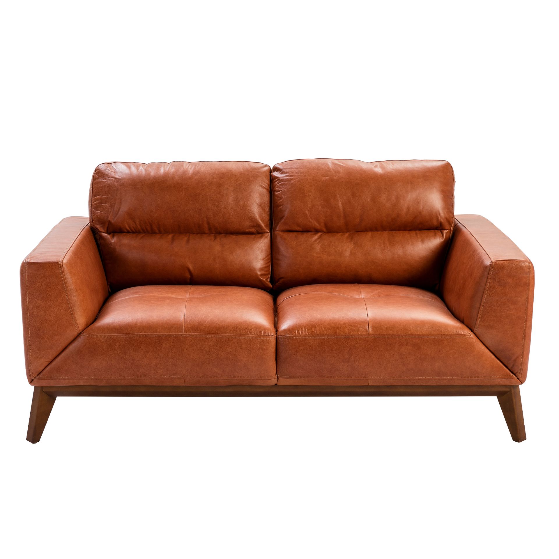 Sofá 2 plazas de diseño moderno tapizado en piel de origen vacuno. Tanto por su estilo, como por sus patas de madera color nogal, este sofá aportará el toque de vanguardia y elegancia que busca para su hogar.