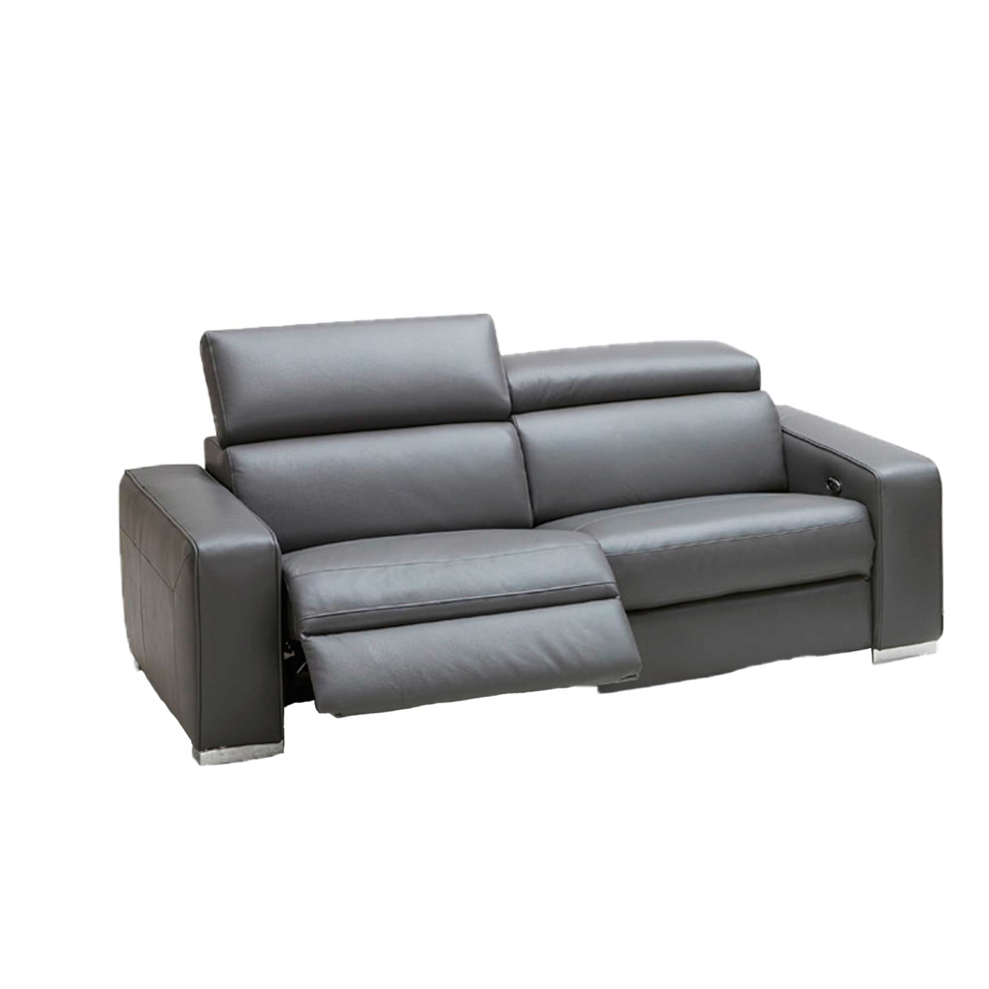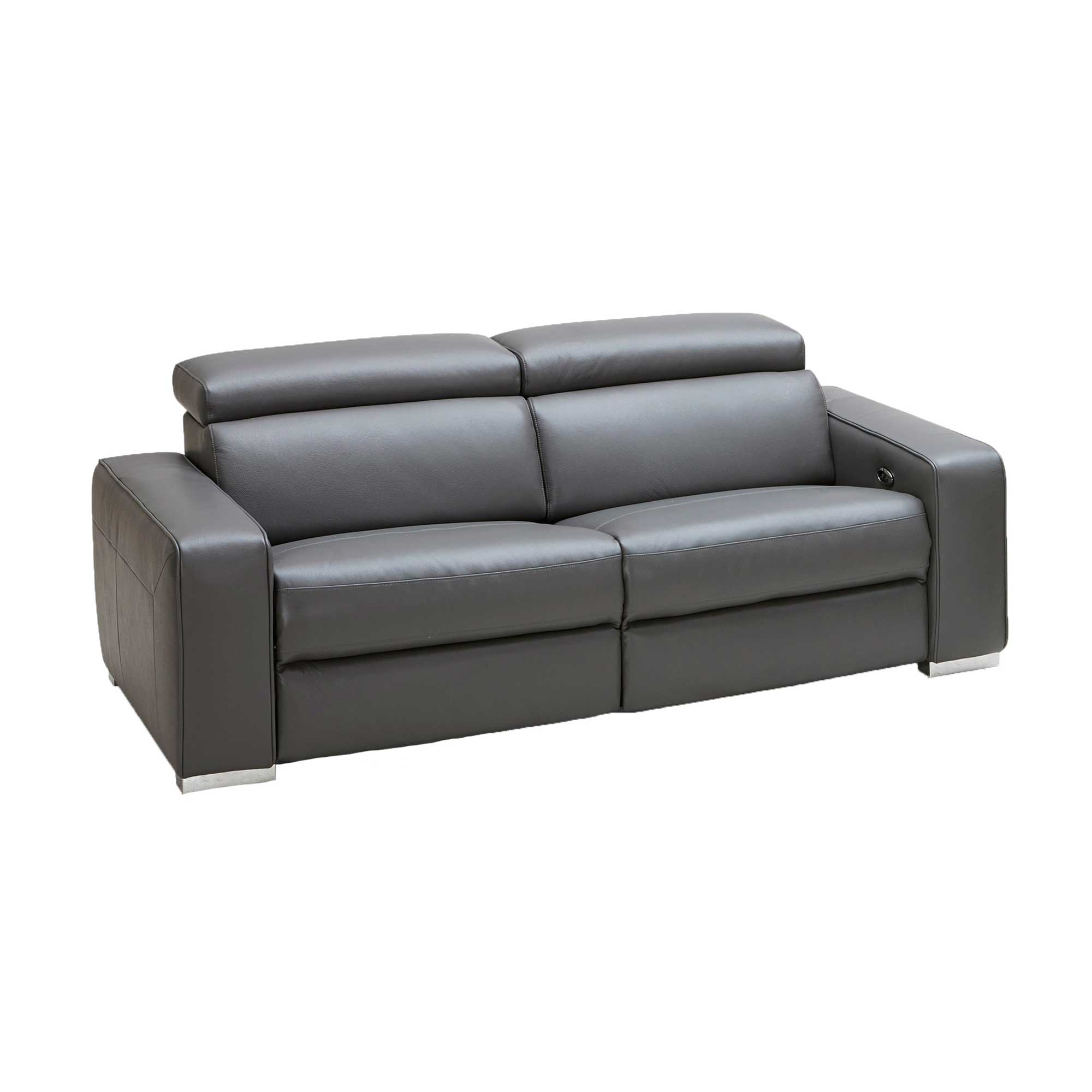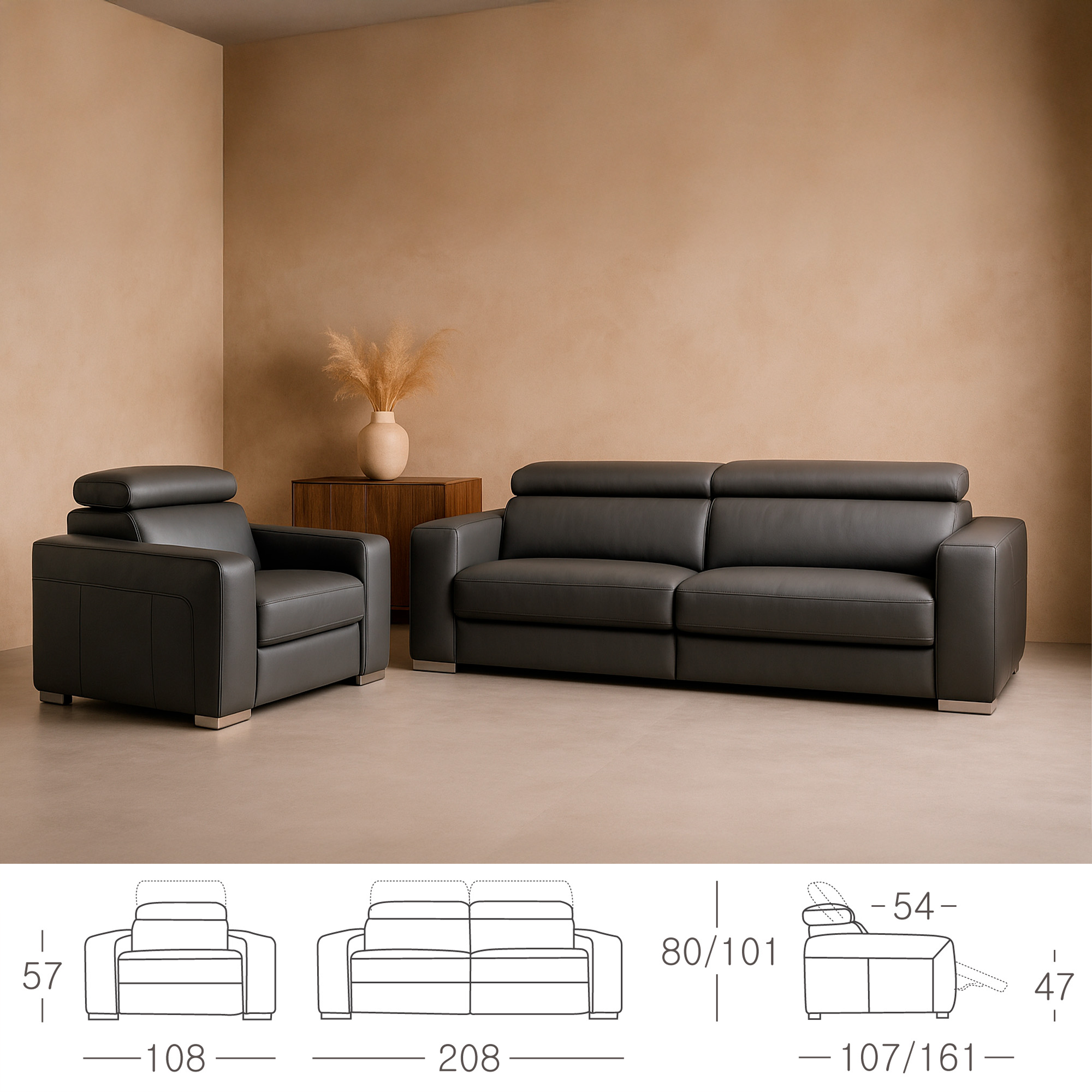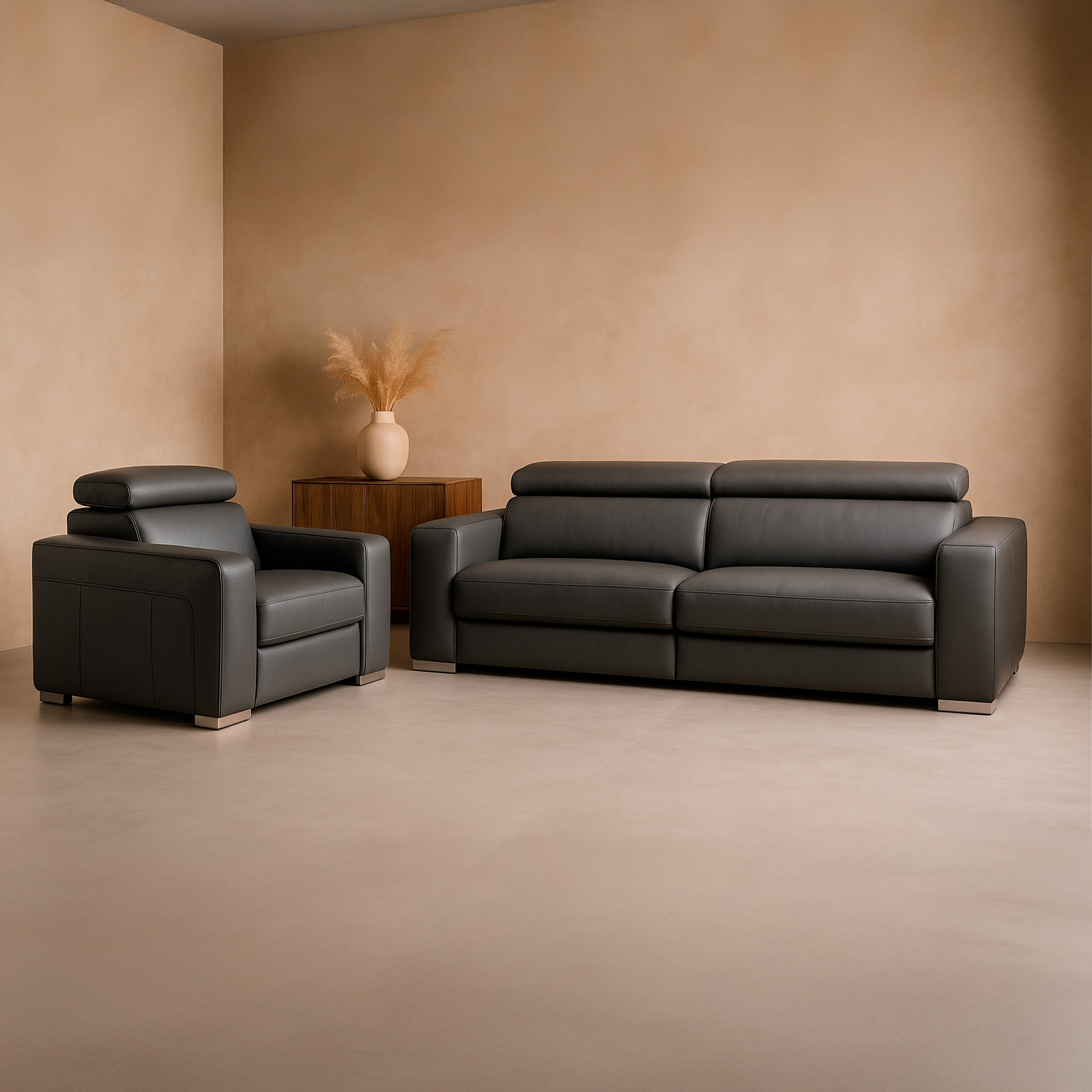 Sofá 3 plazas de diseño moderno tapizado en piel de origen vacuno con reposacabezas para garantizar una mayor comodidad. Tanto por su estilo, como por sus patas de pvc, este sofá aportará el toque de vanguardia y elegancia que busca para su hogar.