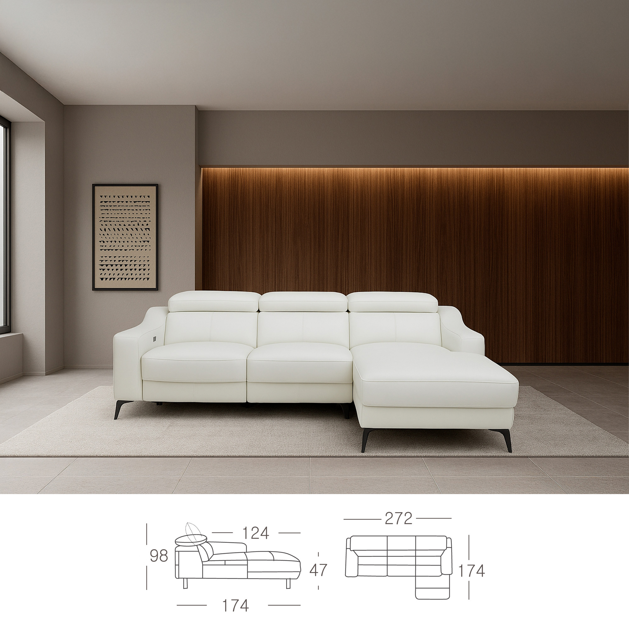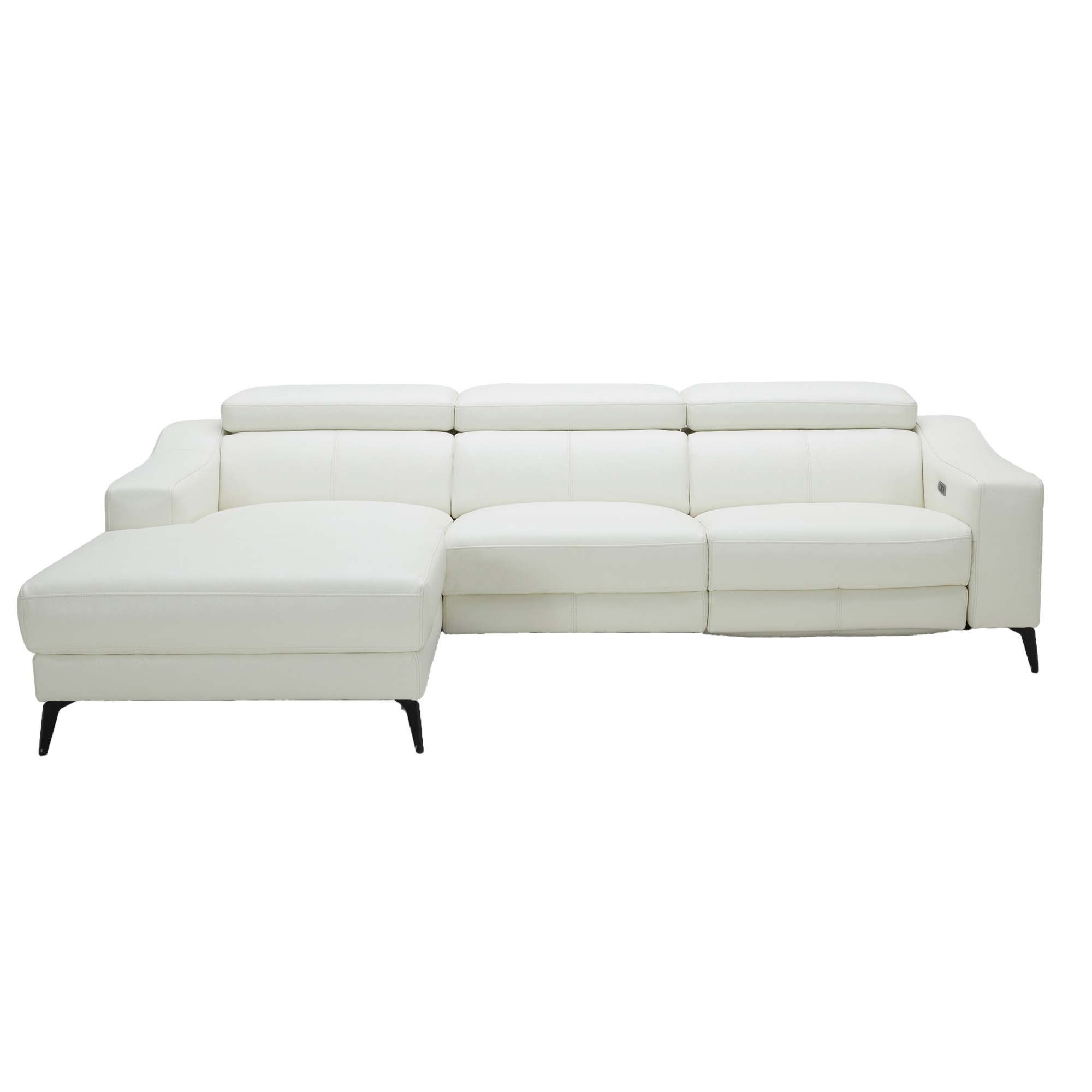 Sofá chaise longue de diseño moderno tapizado en piel de origen vacuno con reposacabezas para garantizar una mayor comodidad. Tanto por su estilo, como por sus patas de acero color negro, este sofá aportará el toque de vanguardia y elegancia que busca para su hogar.