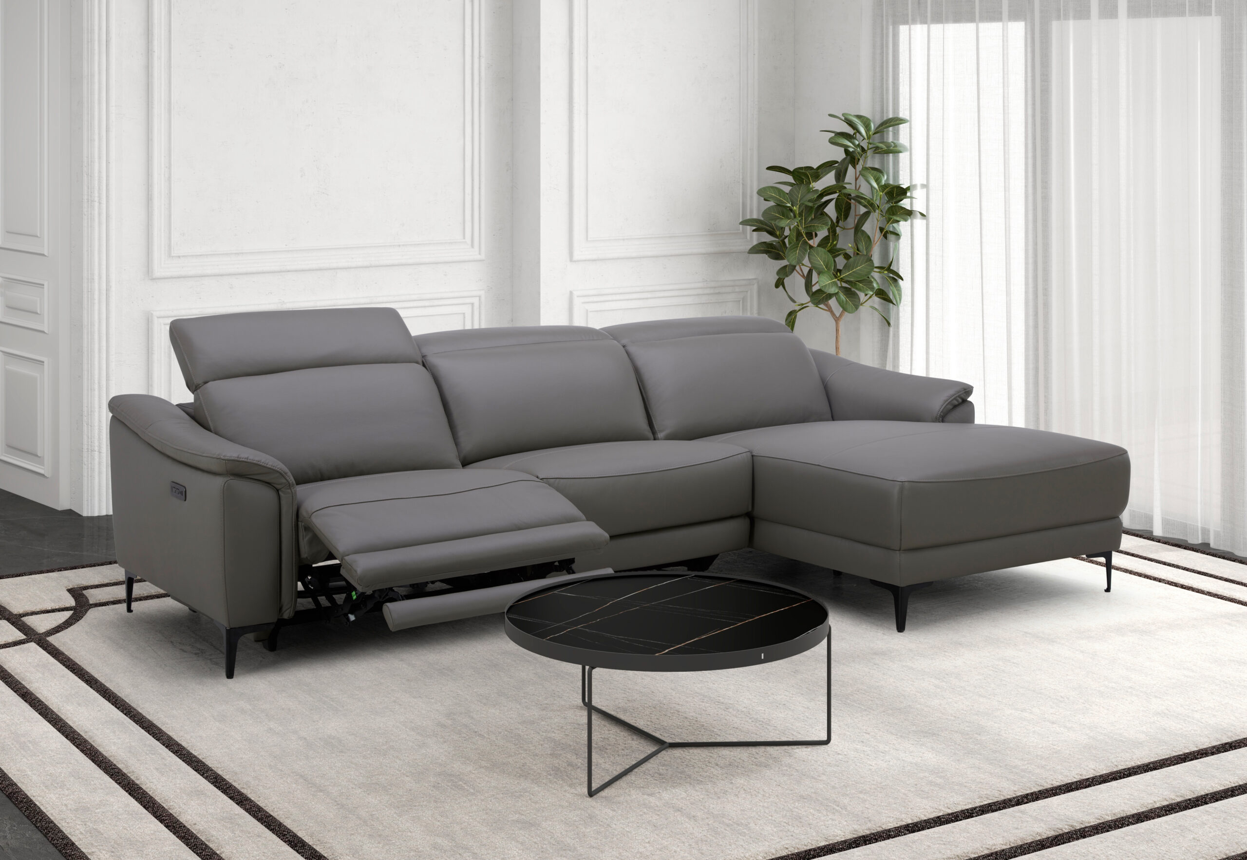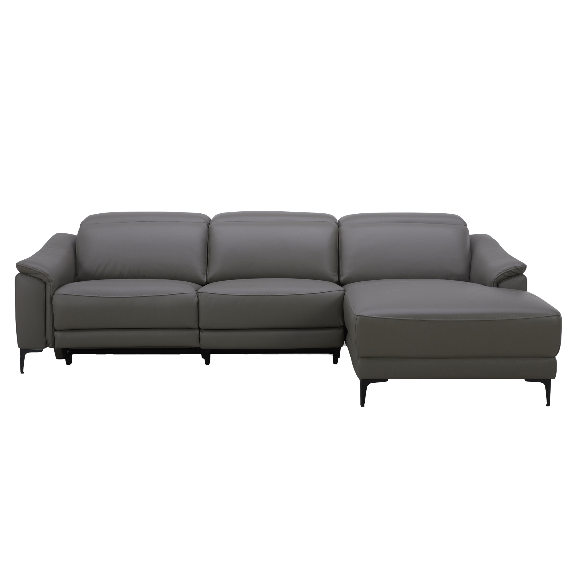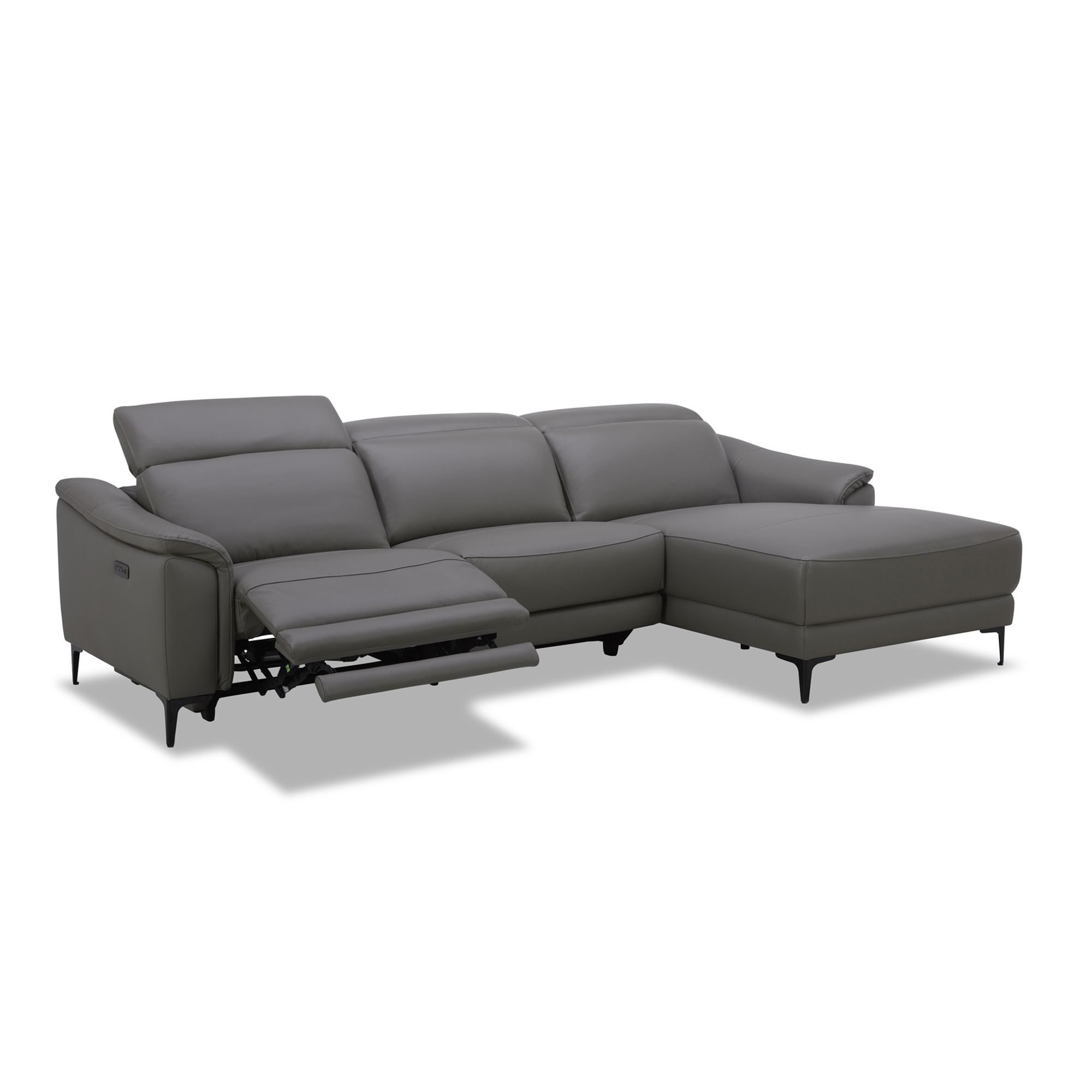 Sofá chaise longue relax de diseño moderno tapizado en piel de origen vacuno con reposacabezas para garantizar una mayor comodidad. Tanto por su estilo, como por sus patas de acero color negro, este sofá aportará el toque de vanguardia y elegancia que busca para su hogar.