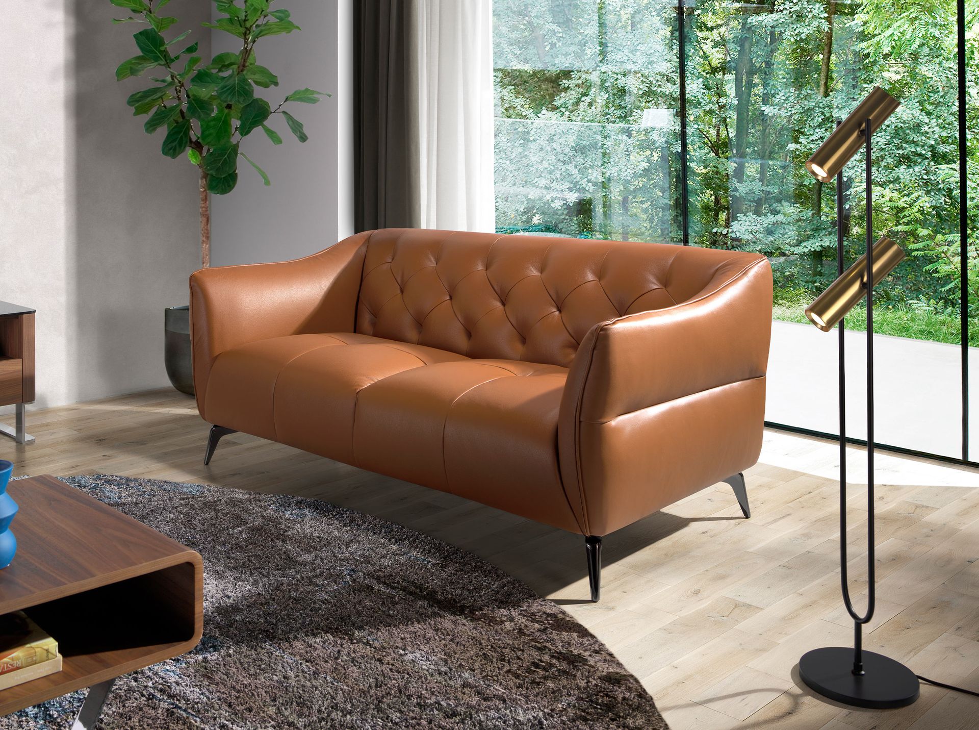 Sofá Chester 2 plazas de diseño moderno tapizado en piel de origen vacuno. Tanto por su estilo, como por sus patas de acero inoxidable oscurecido, este sofá aportará el toque de vanguardia y elegancia que busca para su hogar.
