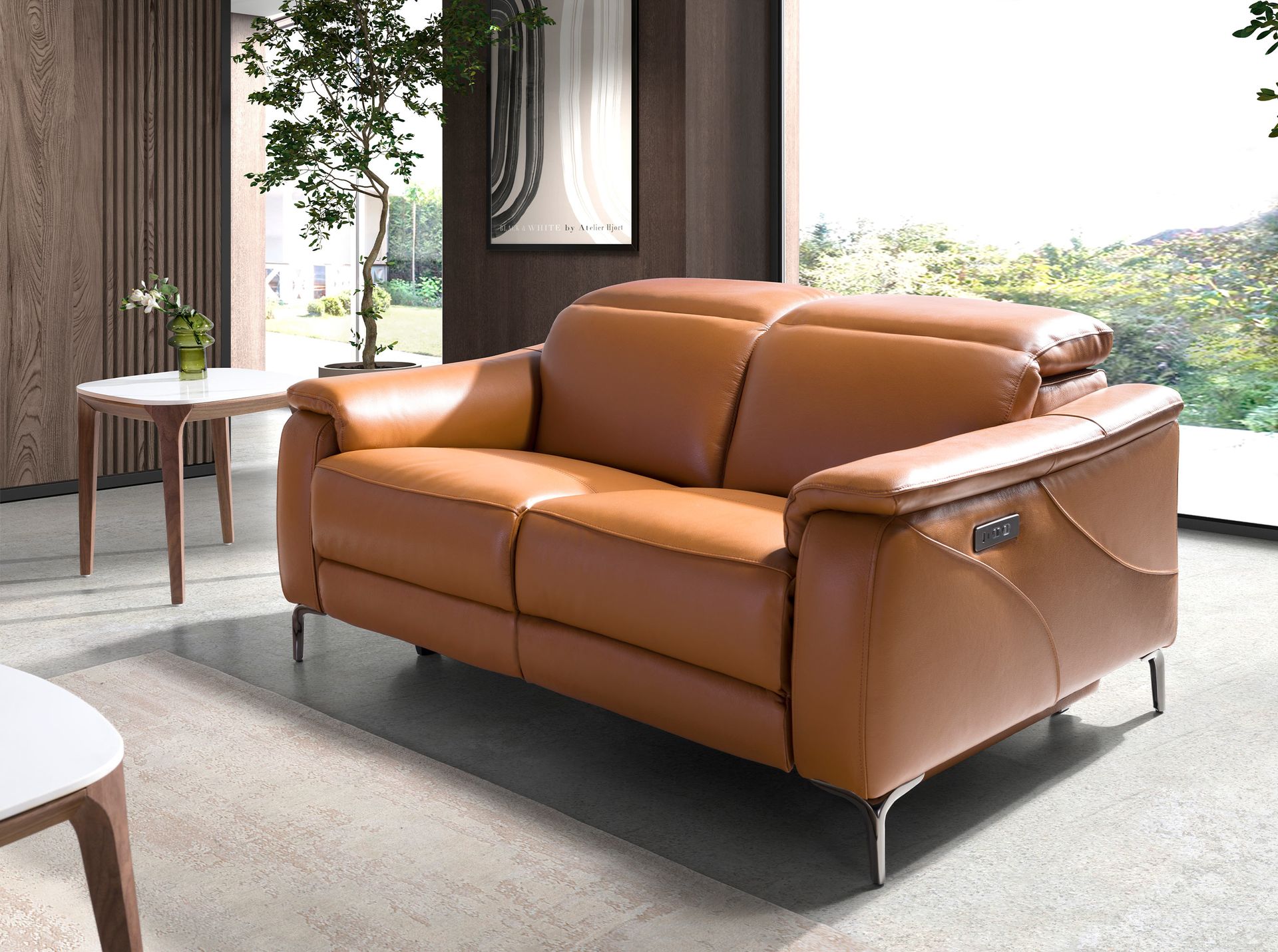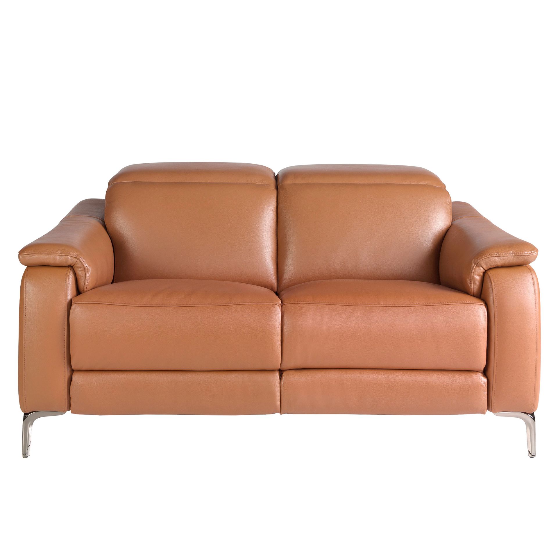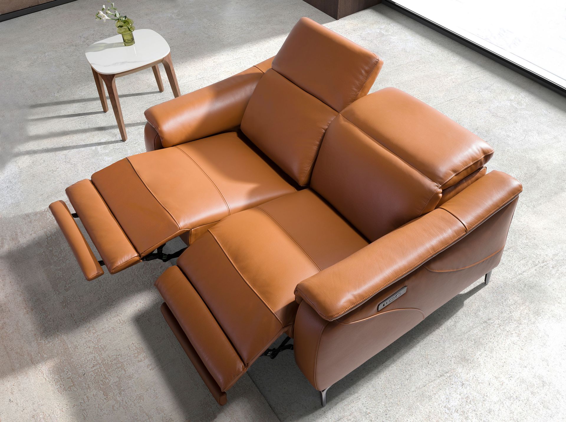 Sofá relax 2 plazas de diseño moderno tapizado en piel de origen vacuno con reposacabezas para garantizar una mayor comodidad. Tanto por su estilo, como por sus patas de acero inoxidable cromado oscuro, este sofá aportará el toque de vanguardia y elegancia que busca para su hogar.