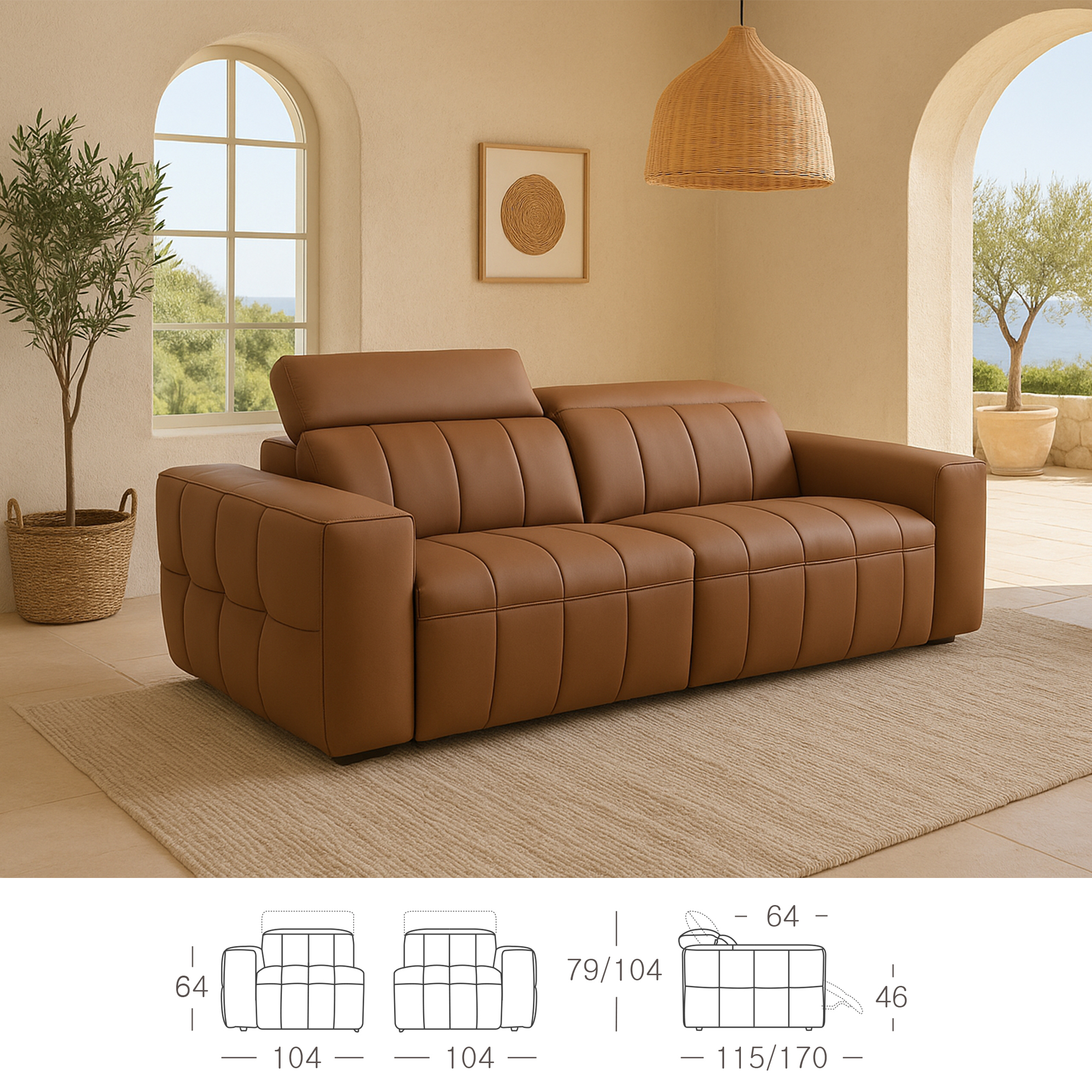 Sofá relax 3 plazas de diseño moderno tapizado en piel de origen vacuno con reposacabezas para garantizar una mayor comodidad. Tanto por su estilo, como por sus patas de pvc, este sofá aportará el toque de vanguardia y elegancia que busca para su hogar.