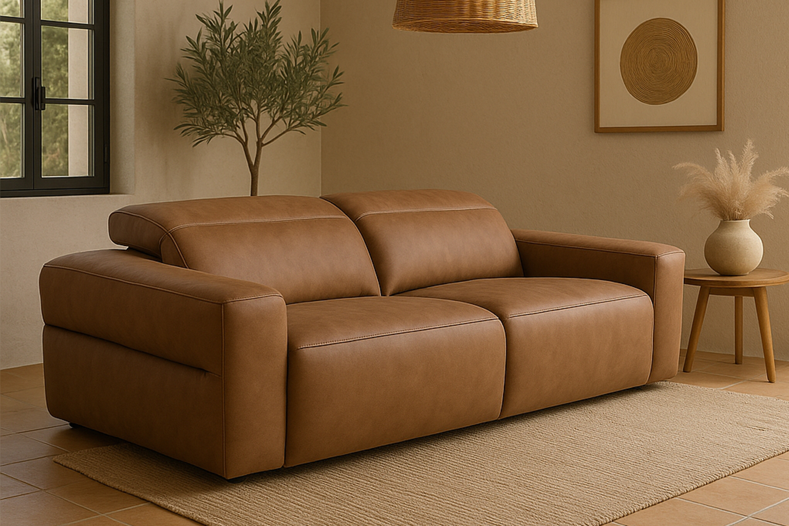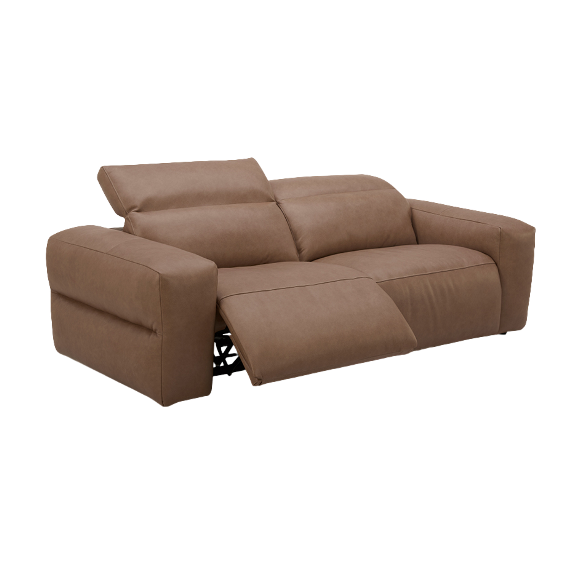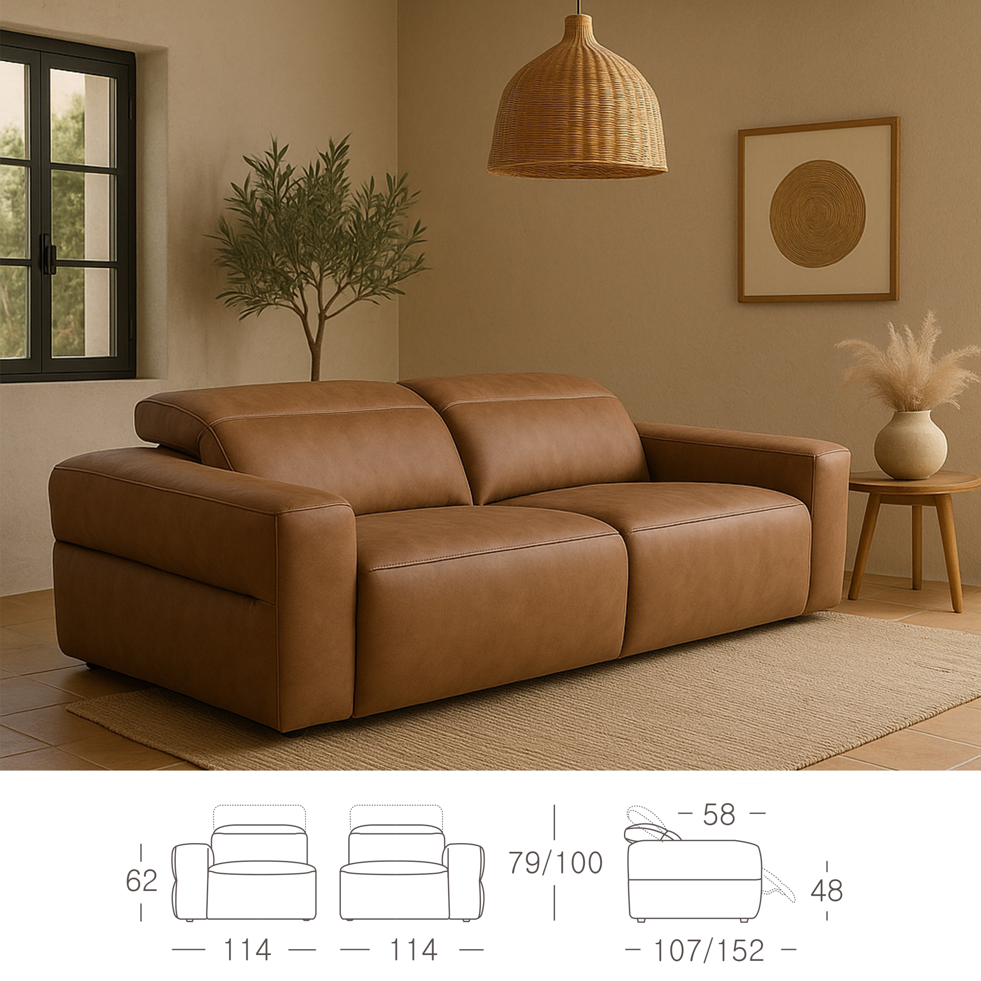 Sofá relax 3 plazas de diseño moderno tapizado en piel de origen vacuno con reposacabezas para garantizar una mayor comodidad. Tanto por su estilo, como por sus patas de acero, este sofá aportará el toque de vanguardia y elegancia que busca para su hogar.