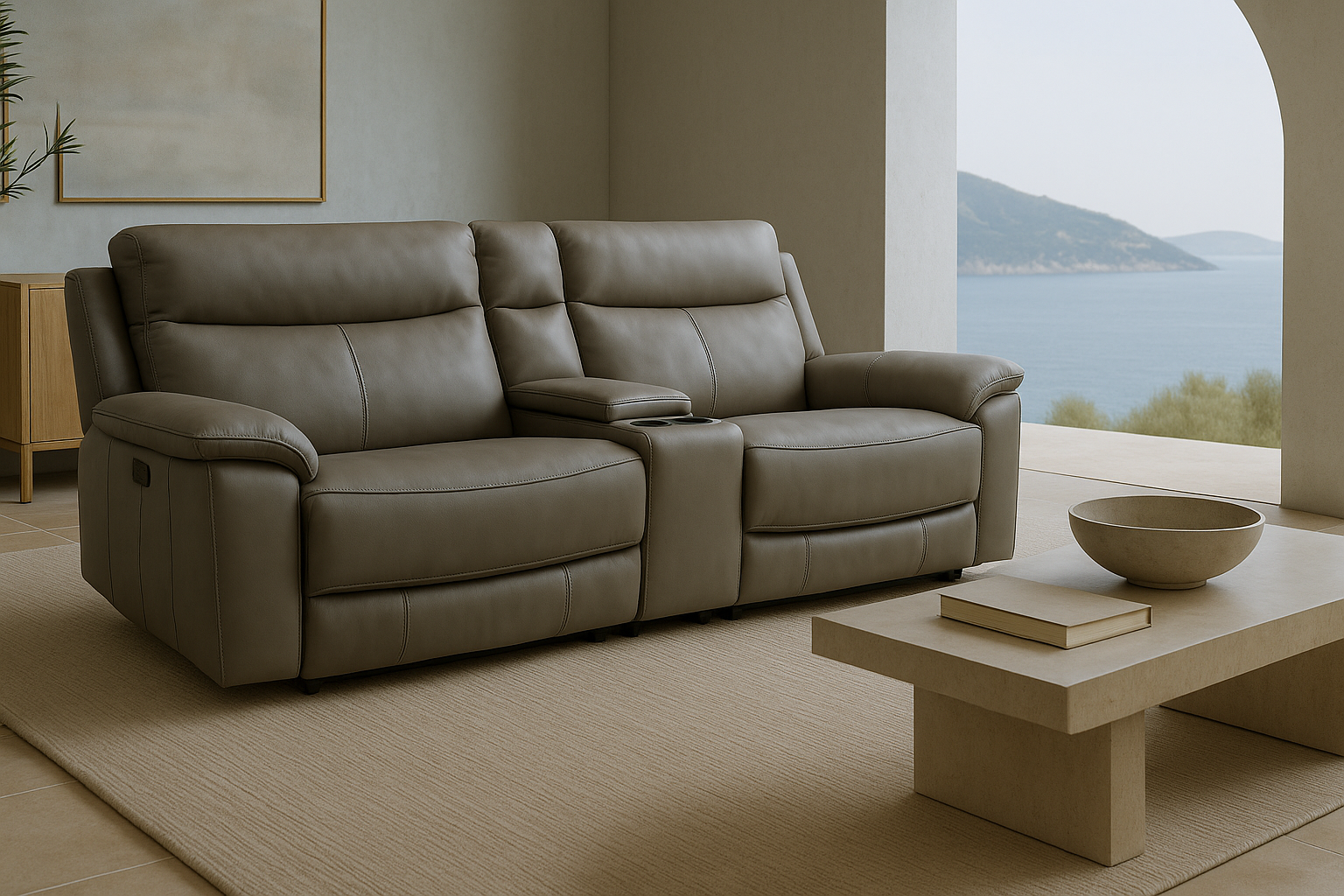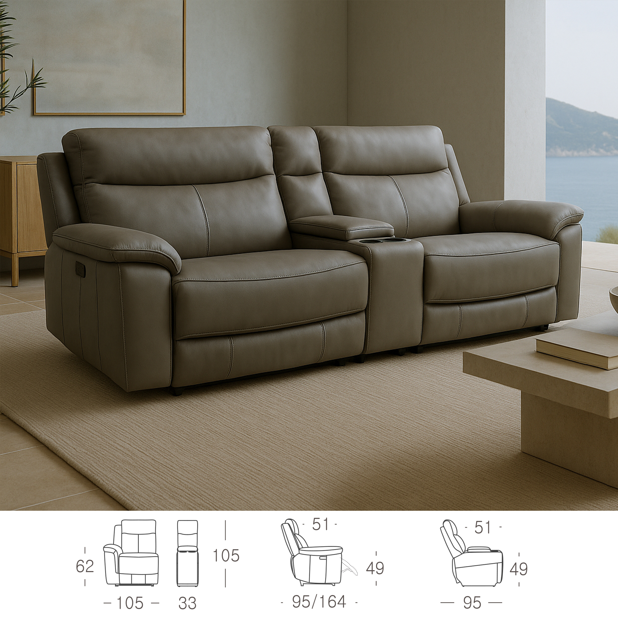 Sofá relax 3 plazas de diseño moderno tapizado en piel de origen vacuno. Tanto por su estilo, como por sus patas de pvc, este sofá aportará el toque de vanguardia y elegancia que busca para su hogar.