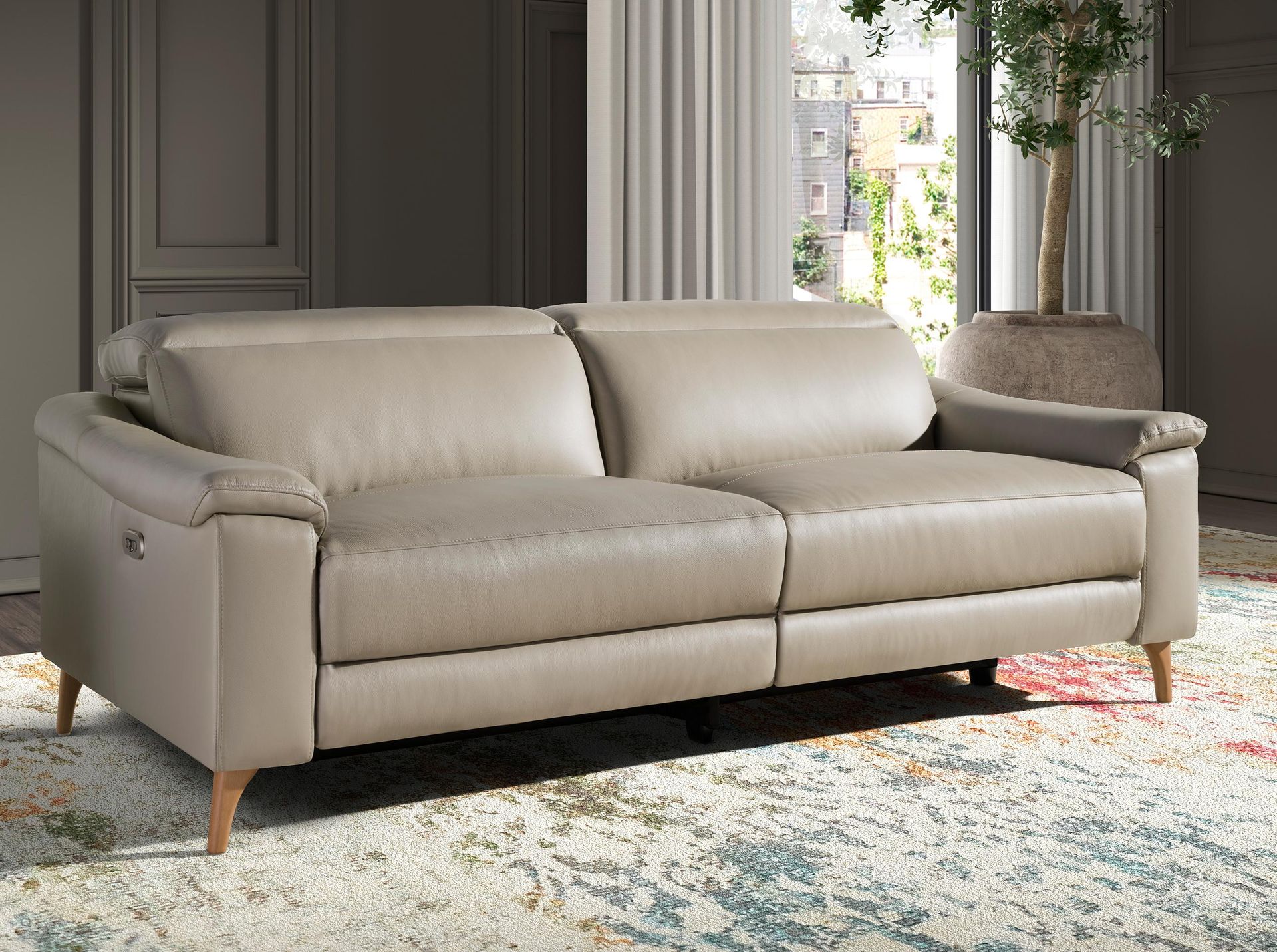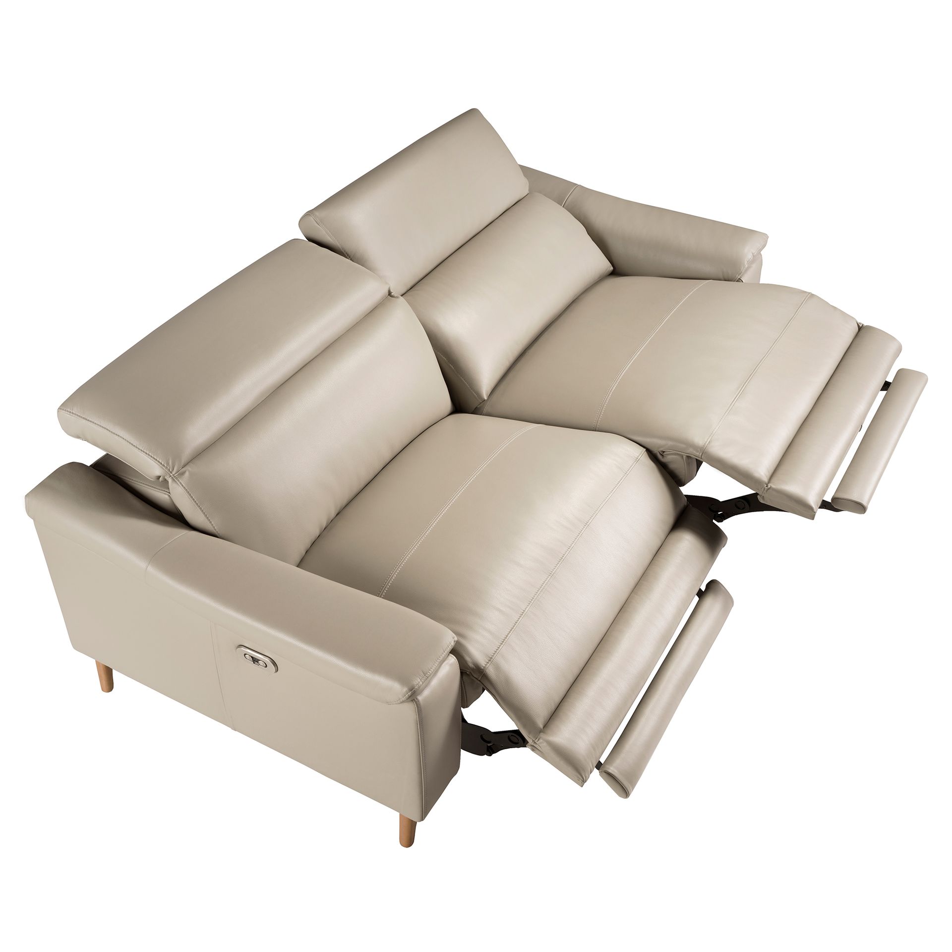Sofá relax 3 plazas de diseño moderno tapizado en piel de origen vacuno con reposacabezas para garantizar una mayor comodidad. Tanto por su estilo, como por sus patas de madera color miel, este sofá aportará el toque de vanguardia y elegancia que busca para su hogar.
