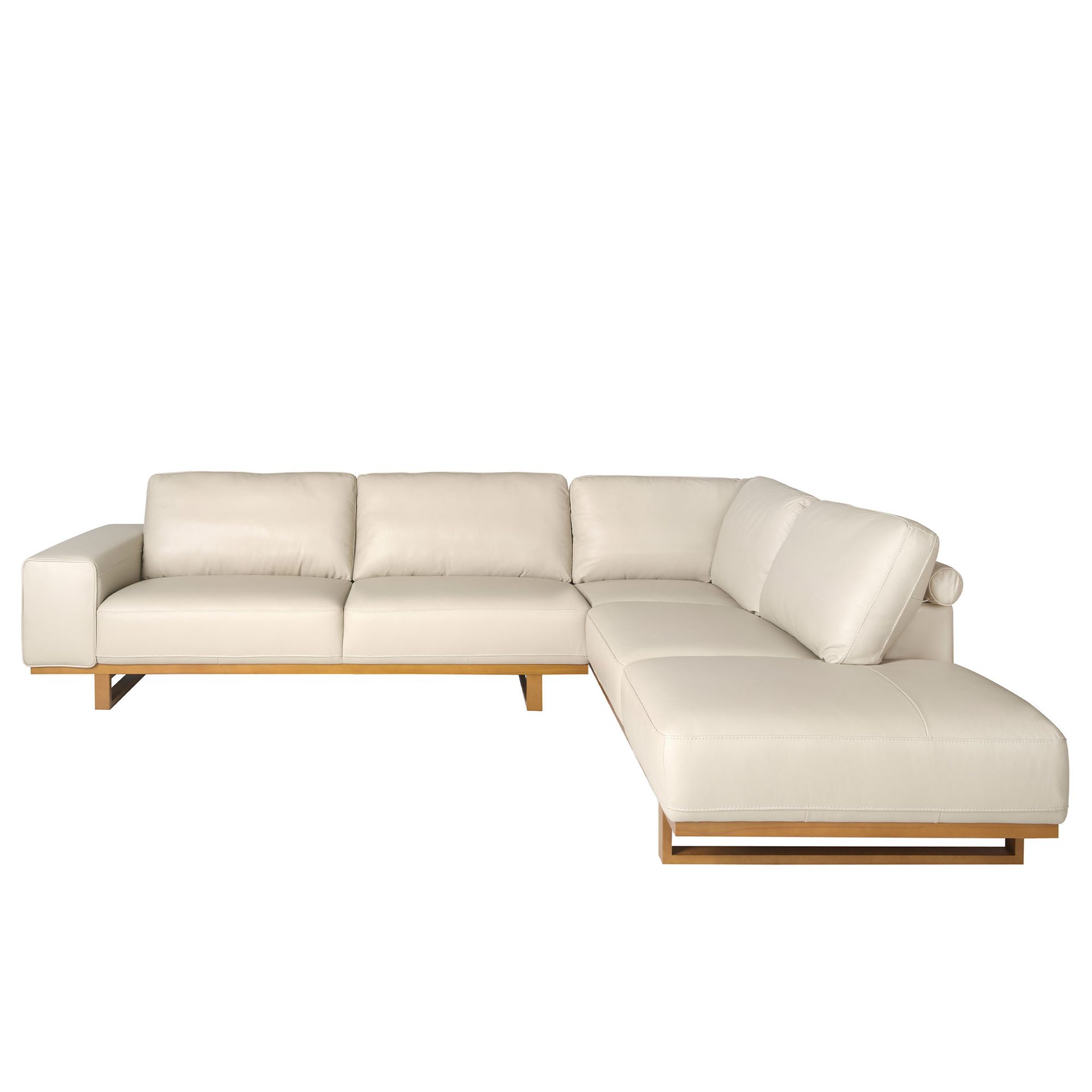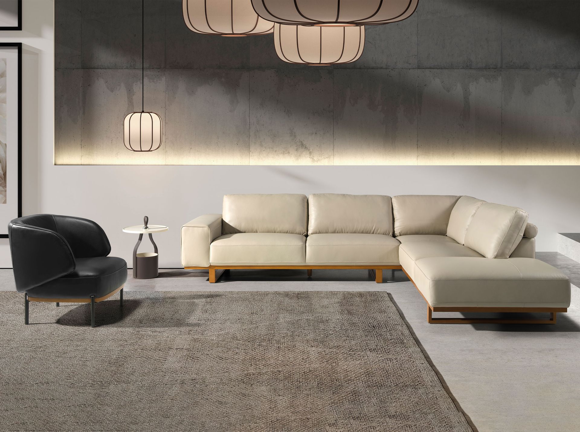 Sofá rinconera de diseño moderno tapizado en piel de origen vacuno. Tanto por su estilo, como por sus patas de madera color miel, este sofá aportará el toque de vanguardia y elegancia que busca para su hogar.