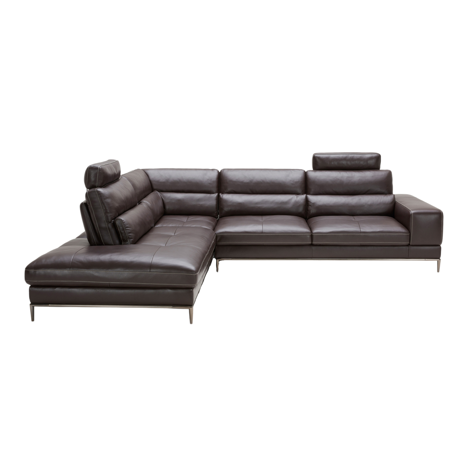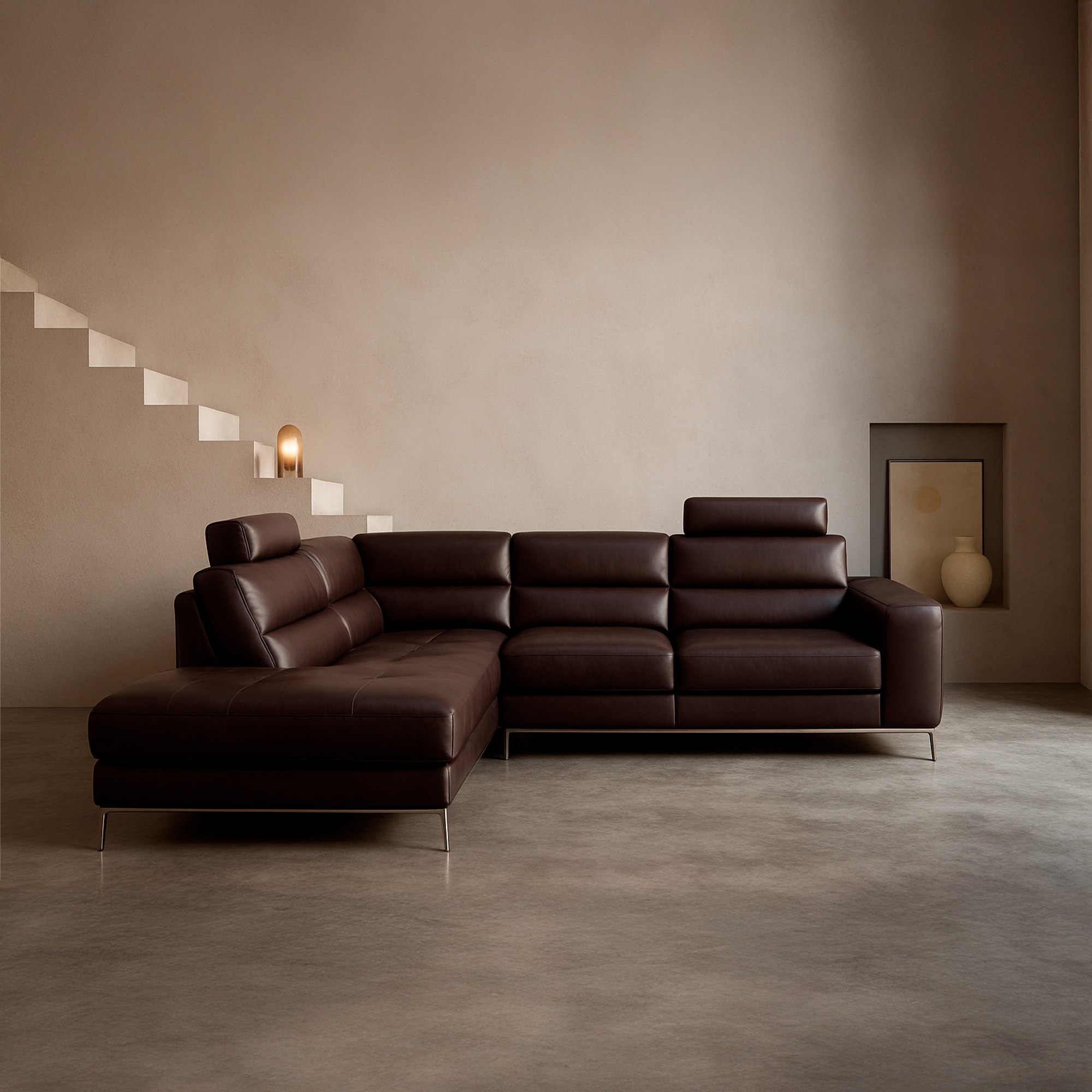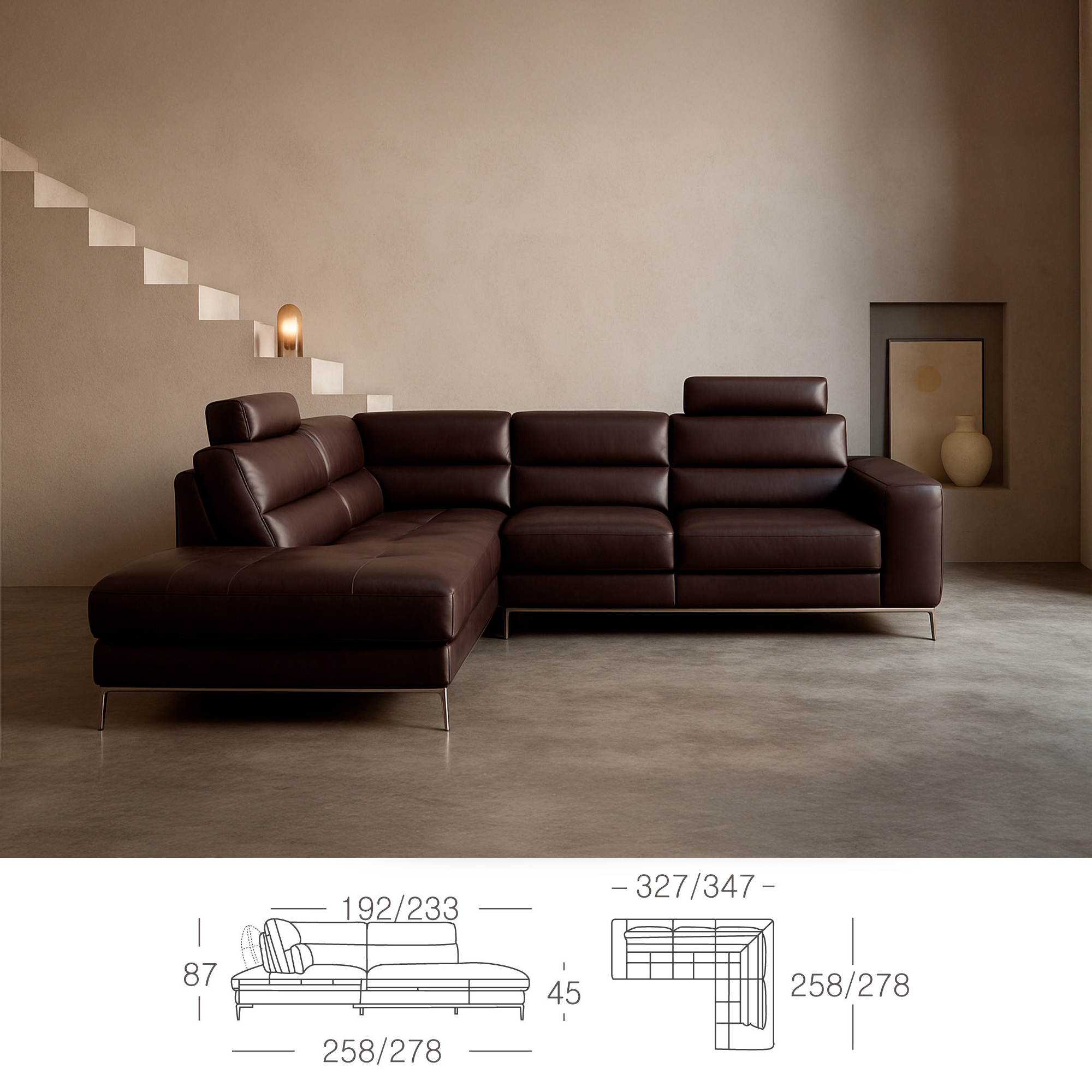 Sofá rinconera de diseño moderno tapizado en piel de origen vacuno con reposacabezas para garantizar una mayor comodidad. Tanto por su estilo, como por sus patas de acero, este sofá aportará el toque de vanguardia y elegancia que busca para su hogar.