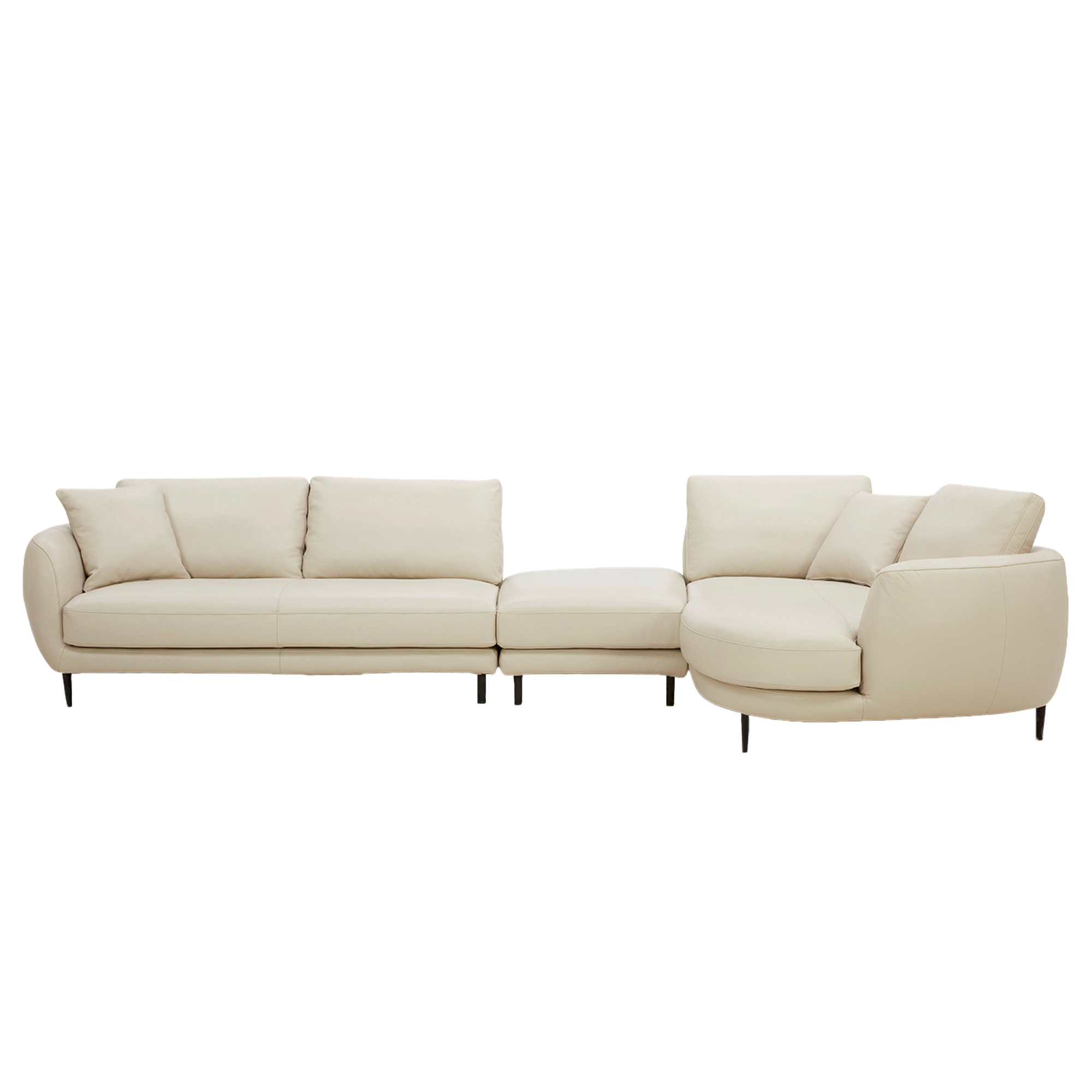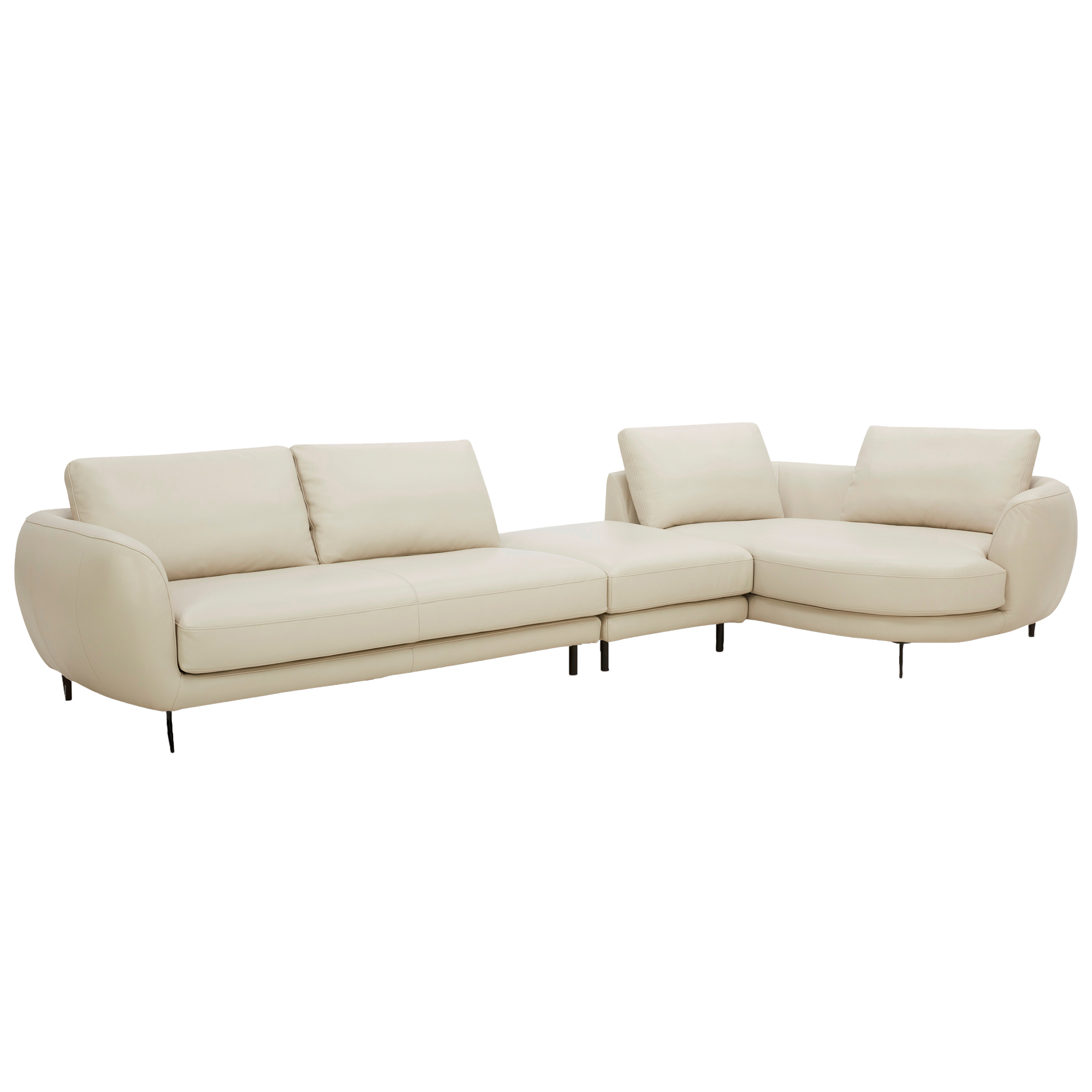 Sofá rinconera de diseño moderno tapizado en piel de origen vacuno. Tanto por su estilo, como por sus patas de acero, este sofá aportará el toque de vanguardia y elegancia que busca para su hogar.