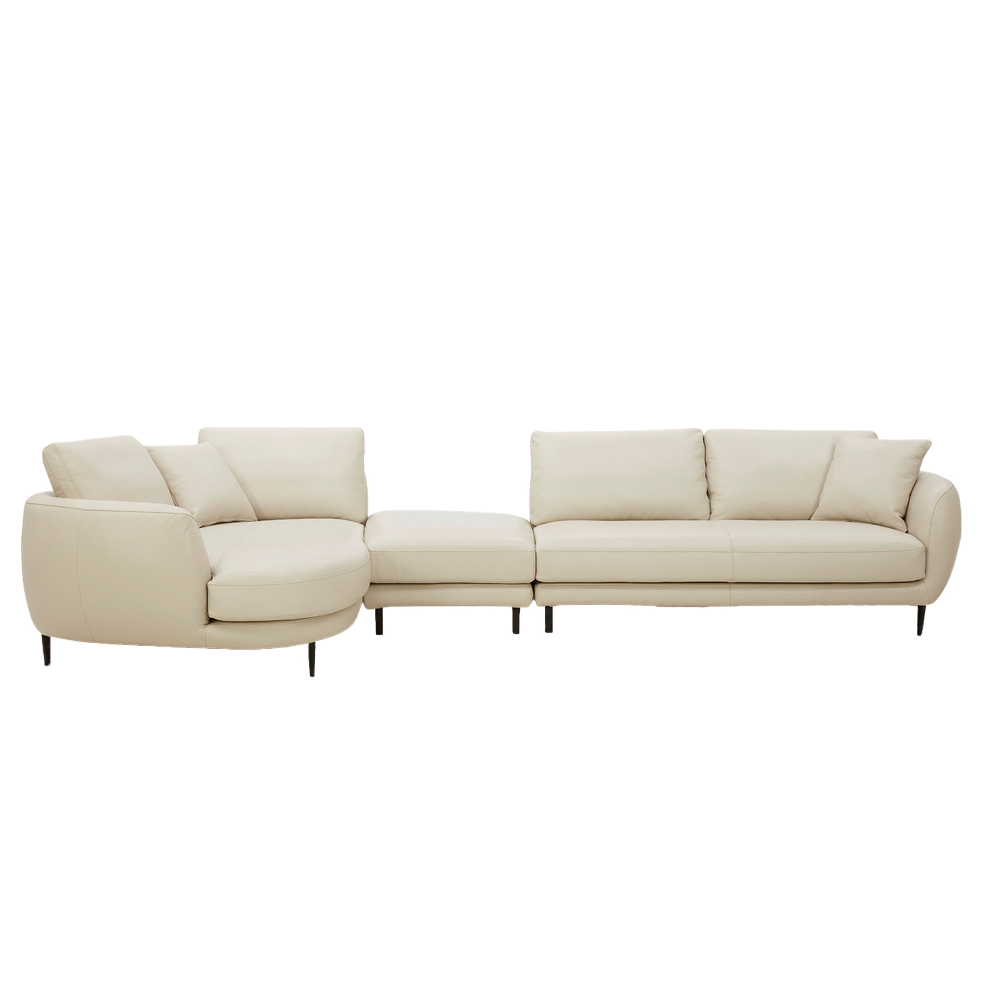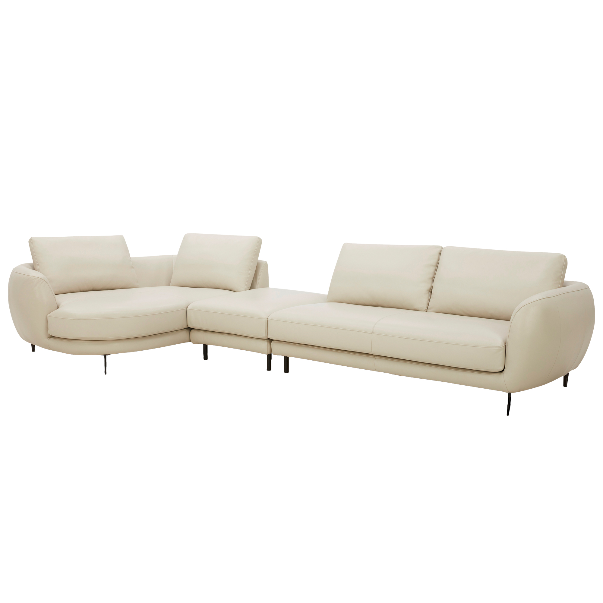 Sofá rinconera de diseño moderno tapizado en piel de origen vacuno. Tanto por su estilo, como por sus patas de acero, este sofá aportará el toque de vanguardia y elegancia que busca para su hogar.